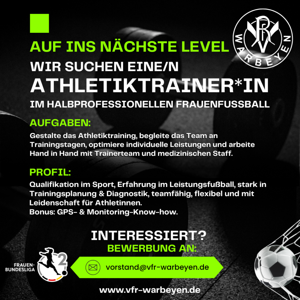 Zur Ergänzung unseres Trainerstabs suchen wir einen engagierten Athletiktrainer*in (m/w/d), der*die sportwissenschaftliche Expertise mitbringt und unsere Mannschaft in den Bereichen Fitness, Belastungssteuerung und Verletzungsprävention auf das nächste Level hebt.